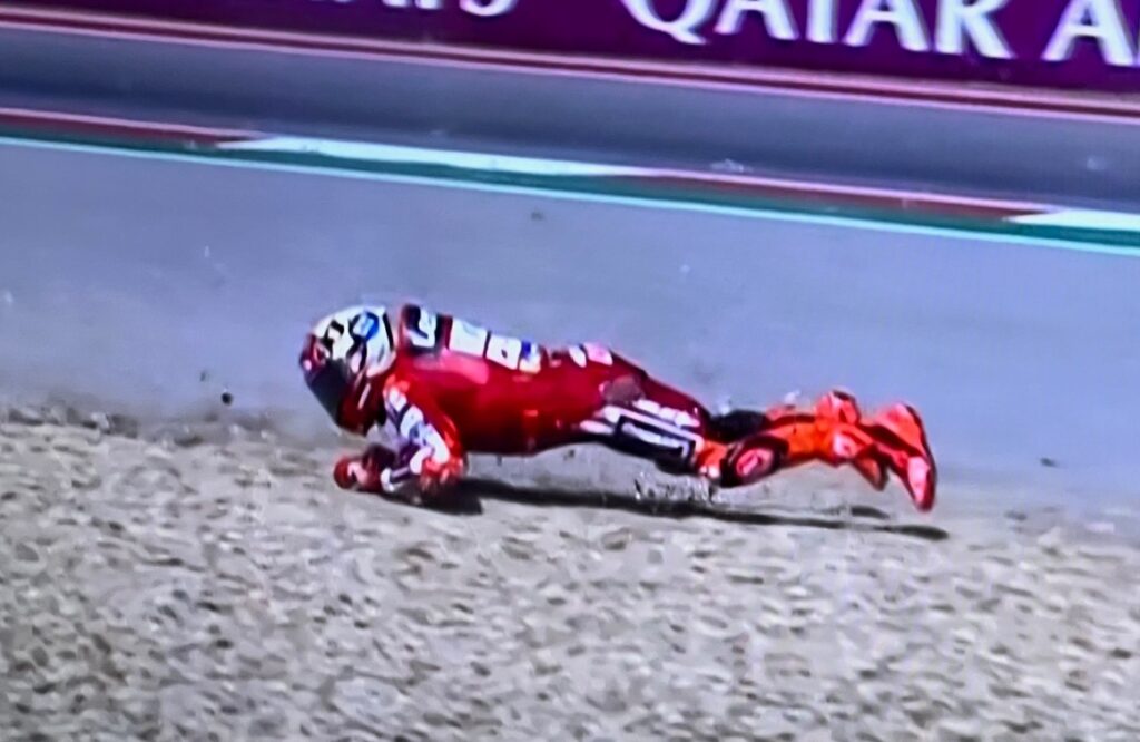 Autant dire que lorsqu’il prend la piste, tous les yeux sont rivés sur la Ducati 93. A ce moment là la hiérarchie est dominée par Pedro Acosta et sa KTM. Un intermède pense t’on. Mais voilà après seulement trois tours lancés, la Ducati 93 guidonne à l’entrée du virage 10. Un virage en rupture et après un mouvement brusque de l’arrière s’est l’avant qui se dérobe sous Marc Marquez. L’Espagnol ne peut éviter la chute et part dans les graviers à plus de 170 km/h. Lorsque l’on retrouve Marquez sur les écrans, il est prostré entre deux blocs de mousse et semble touché sérieusement. Les ralentis montreront que la chute n’a pas été aussi spectaculaire qu’on le craignait. Heureusement mais l’entrée dans les graviers a été rude et Marquez se tient la main gauche.